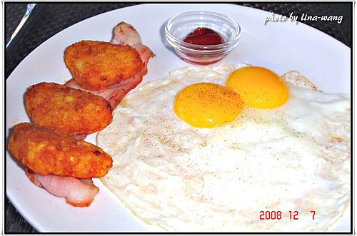 ▼ 一條培垠、三塊薯餅、雙蛋荷包蛋,以男生的份量來說有點少,但這是飯店送的早餐也不能說什麼,至少先墊墊肚子再說。