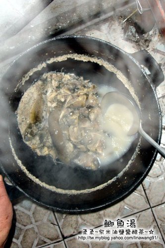 ▼ 三哥說,這鯽魚湯,只要加水跟一點點的油,直接在燒炭爐上煮,一直煮到魚都爛掉,湯變成白色就可以起鍋了,要喝之前再加一點點的鹽巴,就非常有味道了。