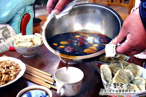 ▼ 在山東喝老酒都習慣溫熱來喝,再加一點紅棗、薑片,劇說有舒筋活血、補氣養神之功效,柔柔有喝一口過,喝起來口味醇厚,但有點微苦,但因為沒喝酒的習慣,只喝一口就不敢再喝了。