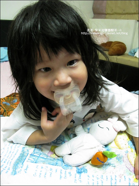 隔天晚上就沒再聽她找奶嘴,晚上照樣睡著~從此就沒聽到小宥宥說要再找奶嘴了,這下柔柔連奶嘴要塗辣椒、騙她被老鼠咬走,什麼方法都不用,就這樣不到2天的時間就戒掉奶嘴了,夠神奇吧.....。