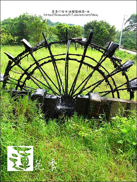 繼續沿著瓜棚步道走,會有一大片的蓮花田,蓮田旁設有古早時期的水車,水車輪上繫有竹桶,將下方溪流的水舀上來灌溉蓮田。