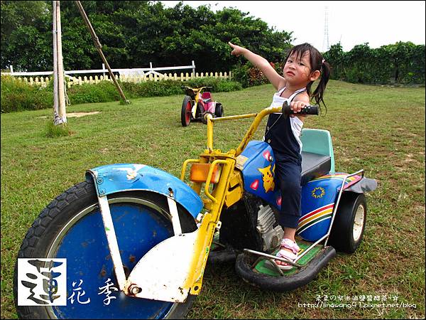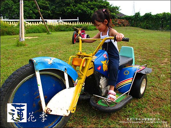 除了這些,還有一大片的綠地廣場,供小朋友跑、玩球,草地上還有不少電動摩托車,小宥宥看到有電動摩托車,開心的坐上去想要發動,但不管她怎樣踩、怎樣轉車頭,電動摩托車都不會動。