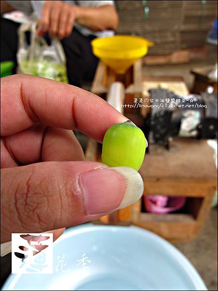 這綠綠的長得像檳榔的蓮子,用機器剝開蓮子的外皮後,裡頭白色部份是可以吃的,柔柔吃了一顆蓮子有淡淡的清香,但也帶有一點點的苦味。